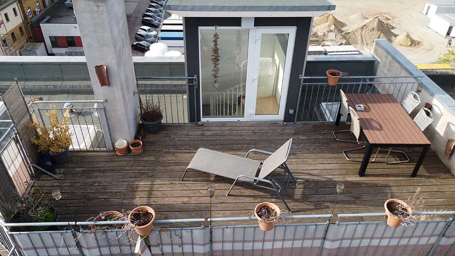 - Terrassenaustritte als Holzständerwerk verkleidet mit HPL-Platten